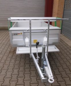 Einachs-Plateauanhänger, mit Auflauf- und Feststellbremse Rückmatik, für Gartentraktoren und Zugmaschinen, mit einer maximalen Geschwindigkeit von 40 km/h, bei einer Nutzlast von 850 kg.